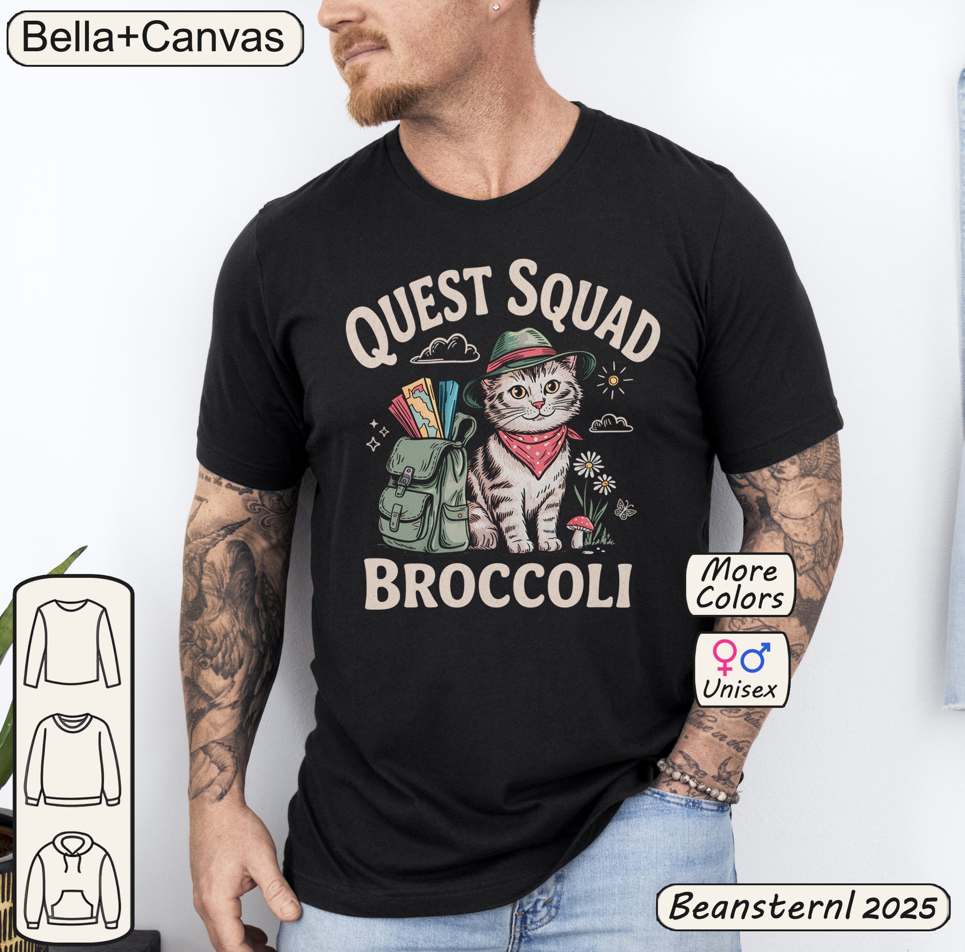 Quest Squad Broccoli Cat Tee – Funny Hiking Meme Shirt
