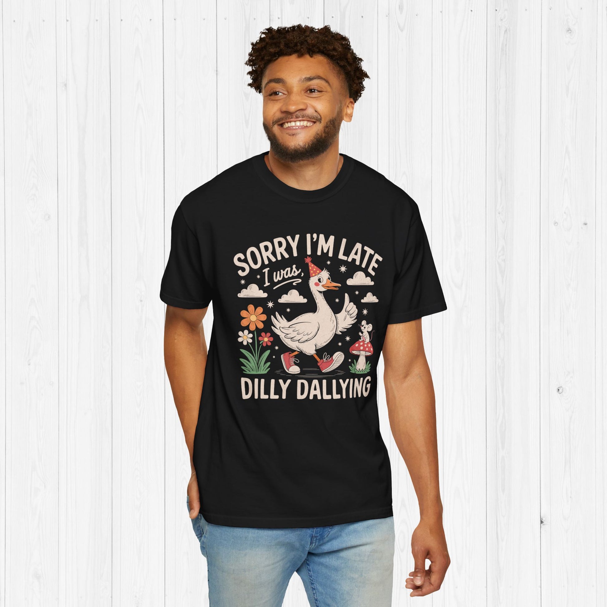 Ever been late because you were just vibing? 🪩 This “Sorry I’m Late I Was Dilly Dallying” shirt is your official excuse and your new favorite retro graphic tee. Featuring an original design of a delightfully unbothered goose doing its own thing, this punny t shirt brings the ultimate dose of Gen Z humor with a side of retro charm. 🦢✨